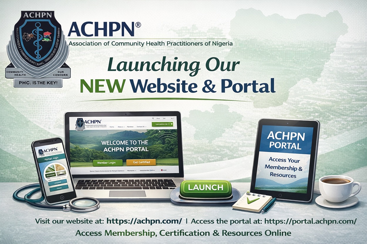 The Association of Community Health Practitioners of Nigeria (ACHPN) proudly announces the official launch of its new website and online membership registration portal, marking an important milestone in strengthening communication, professional development, and collaboration among Community Health Practitioners nationwide. The new digital platforms provide a centralized space where practitioners can access important information about the Association, stay updated on professional activities, and conveniently register or manage their membership online. Members and prospective members can visit the official website at https://achpn.com to learn more about the Association’s mission, programs, and updates, while the membership registration and management portal is available at https://portal.achpn.com for seamless registration and profile management. ACHPN encourages all Community Health Practitioners across Nigeria to take advantage of these platforms and complete their online registration as part of the Association’s ongoing efforts to promote professionalism, unity, and excellence in community health practice. 🌍🩺